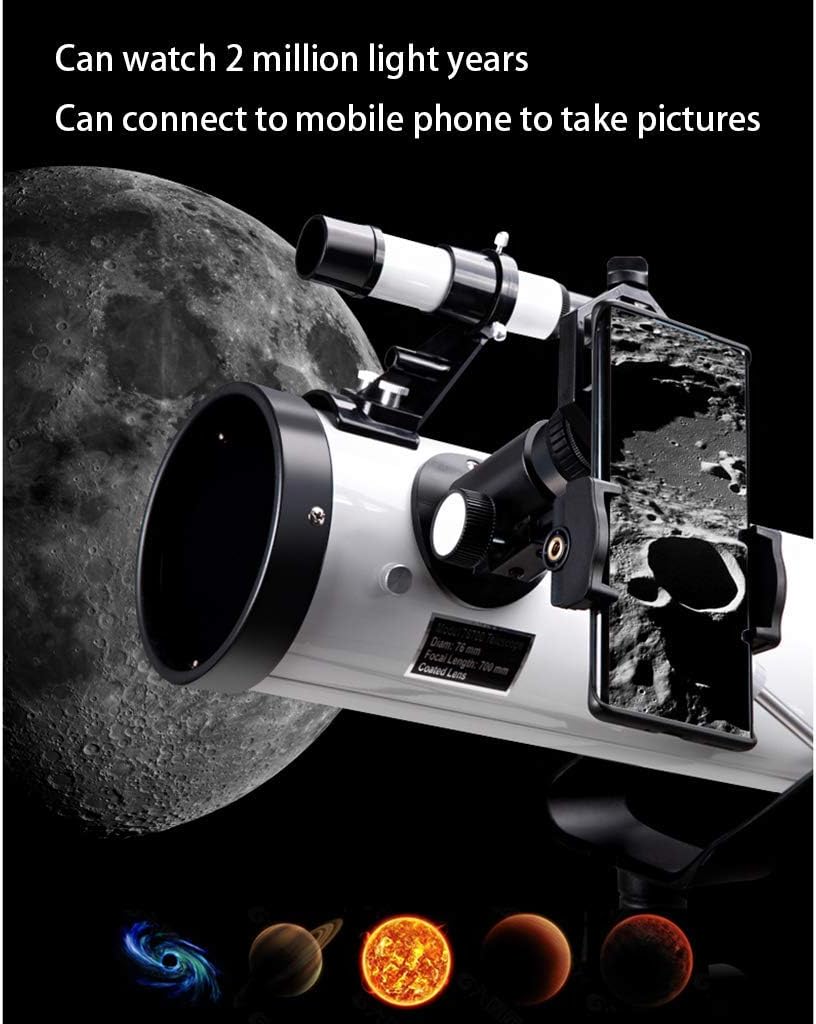 - 【76mm Large Aperture】-- This 76mm astronomical reflector telescope includes 3 eyepieces ( H20MM, H12.5MM, SR4MM), 700mm focal length, large view, perfect for observing aurora, moon, planets, meteor, scenery, bird.