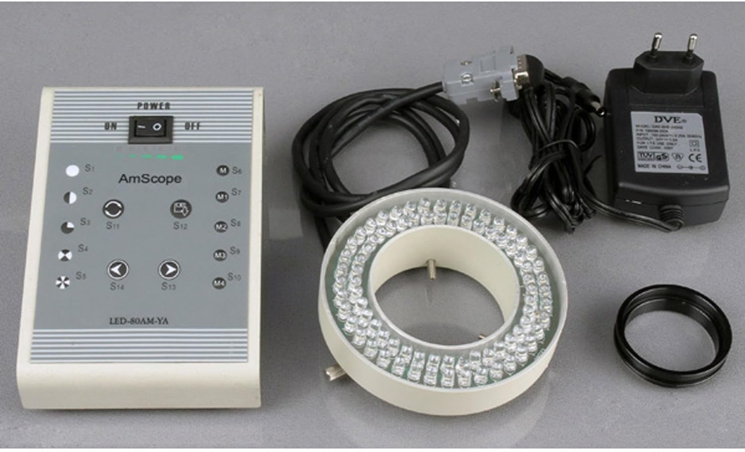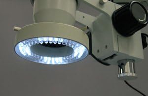 The removable 80-bulb LED ring light has eight separate zones to independently control light intensity and direction, and five programmable memories to remember settings for quick access across tasks. The ring light provides bright, cool light and shadow-free illumination for working with temperature-sensitive or live specimens. A rheostat controls the amount of light emanating from the lamp. Power and adjustment controls are located on a control box to speed adjustments. The ring has a 2-5/8" (66mm) inside diameter and a 4-3/8" (110mm) outside diameter. The light has an optimum working range of 2-3/8 to 5-1/2" (60 to 140mm). It has a 100,000-hour life span and a 110V-240V variable power supply. The microscope has a pillar-style table stand. It has a 3-3/4" (95mm) diameter reversible black and white stage plate to provide contrast with light- and dark-colored specimens, and large stage clips to secure the specimen during viewing. The solid cast-steel base is 0.75 x 10 x 12.5 inches/20 x 280 x 320mm (H x W x D, where H is height, the vertical distance from the lowest to highest point; W is width, the horizontal distance from left to right; D is depth, the horizontal distance from front to back).