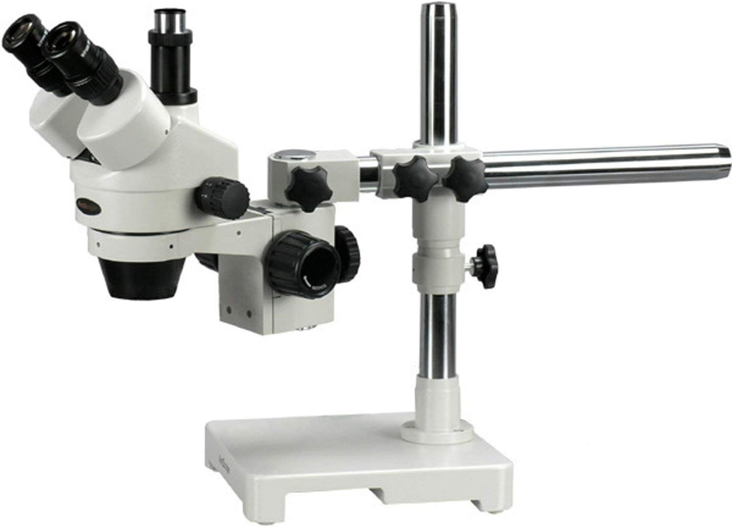 - AmScope SM-3TZ-FODR-P stereo zoom microscope with single-arm boom stand