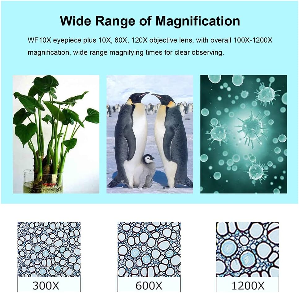 - - Wide Range of Magnification: WF10X eyepiece plus 10X, 60X, 120X objective lens, with overall 100X-1200X magnification, wide range magnifying times for clear observing.